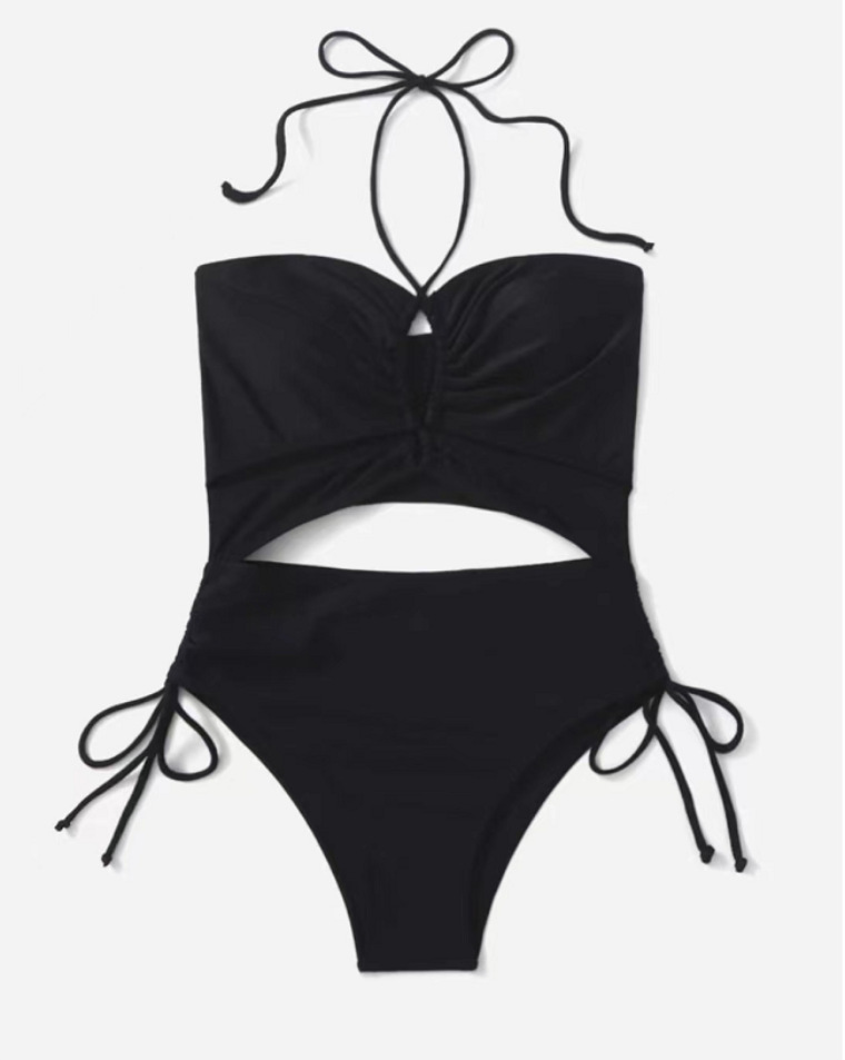 This halter neck tie bikini features a sleek solid color design with a stylish hollow detail, offering both support and a flattering fit. The adjustable halter ties ensure a customizable and secure wear, making it ideal for comfortable beach or poolside lounging. Crafted for a modern, minimalist look, this bikini combines simplicity with subtle sophistication.