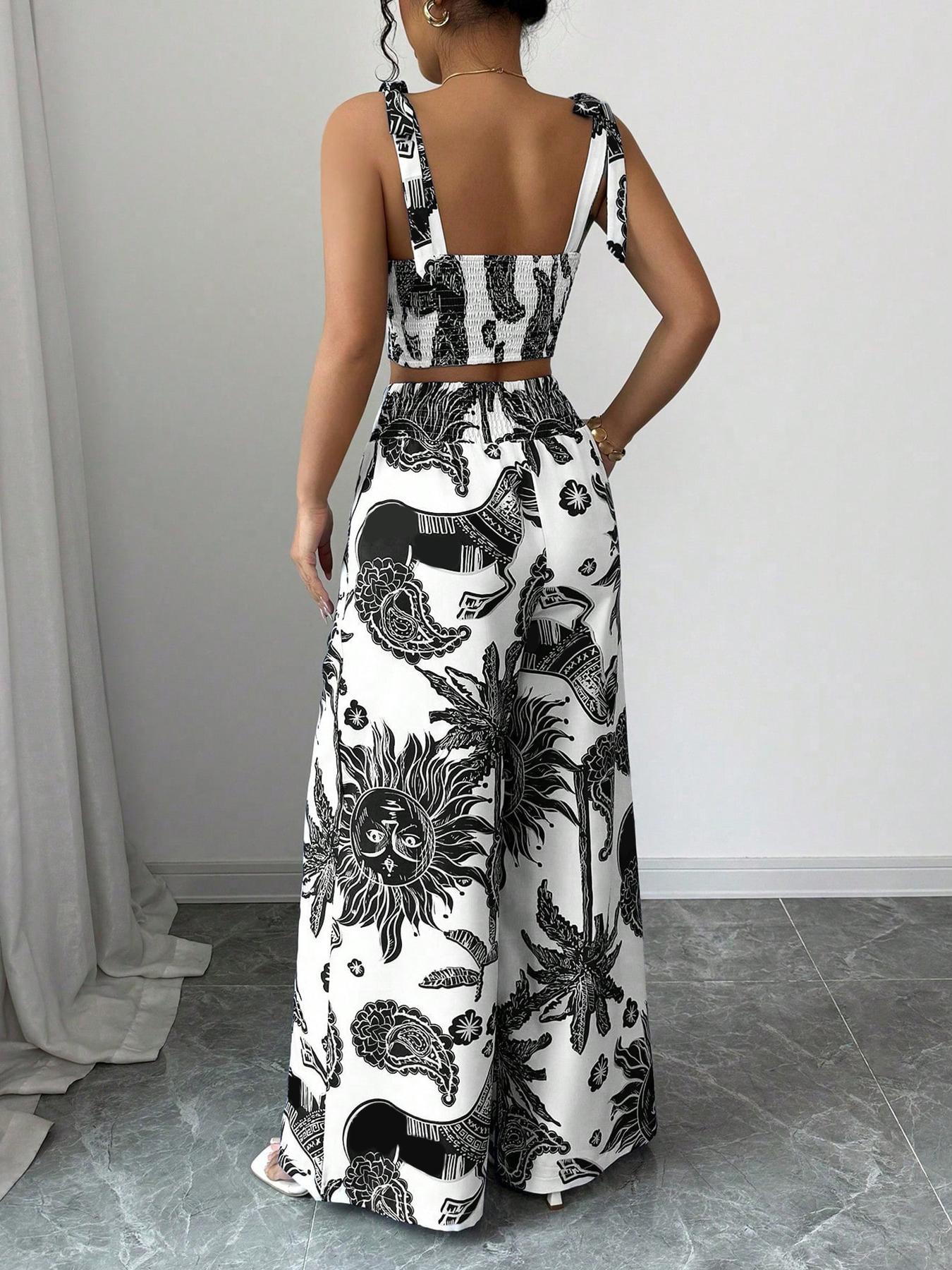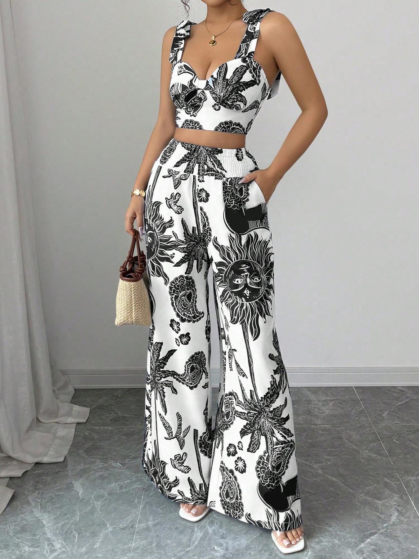 Features: This two-piece summer outfit features a sleeveless top, high waist, wide-leg pants, wide belt, and is designed with unique style elements.